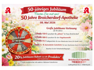 Kommen Sie vorbei und erleben Sie mit uns diesen besonderen Tag. Lassen Sie uns gemeinsam auf 50 Jahre zurückblicken – auf viele Begegnungen, Gespräche und Momente, die uns geprägt haben. Und vor allem darauf, dass wir als Broicherdorf‑Apotheke auch in Zukunft verlässlich an Ihrer Seite stehen.